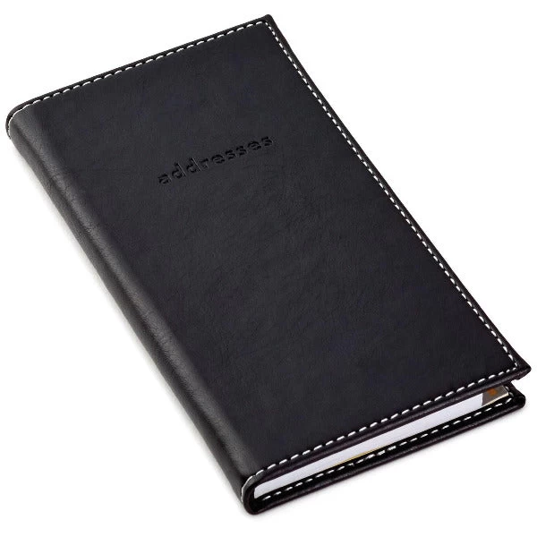 - Slim simulated leather address book features etched lettering on black cover with topstitching along edges and a tabbed alphabetical index inside.