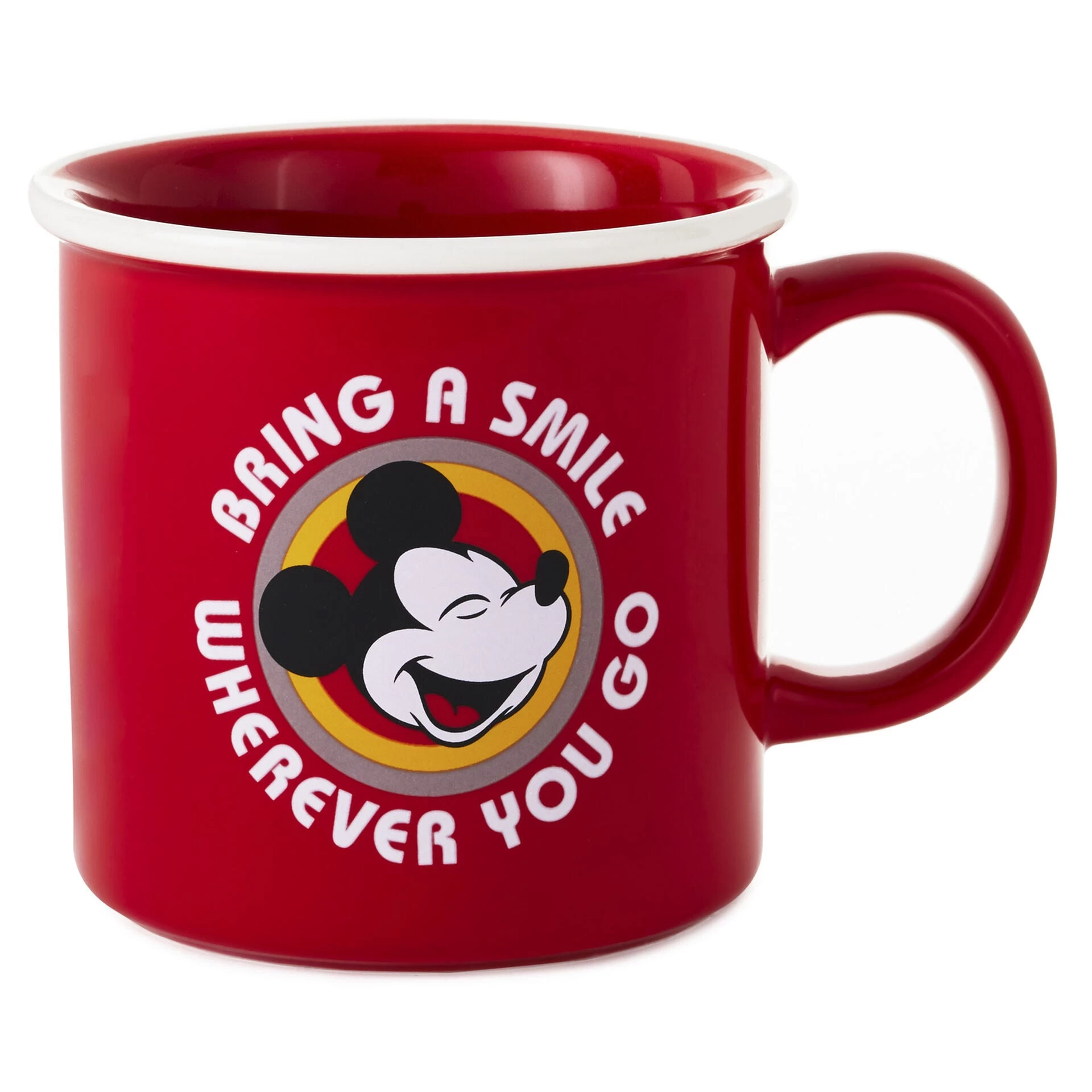 Start each day with big smiles and a hefty helping of happiness when you sip a delicious beverage from this red ceramic mug. Your daily cup of joe will be even more satisfying when paired with this vibrant Mickey Mouse design and the inspirational message it serves up.