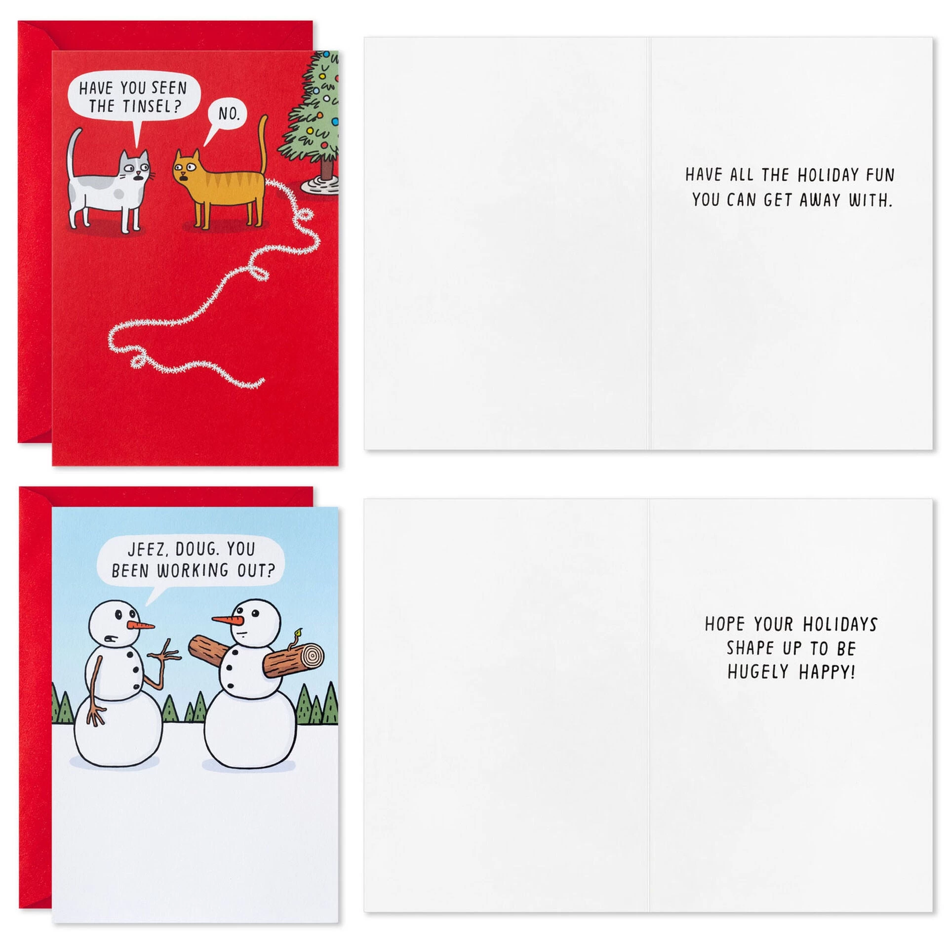 Funny boxed Christmas cards assortment features a musical donut, a Santa-style fish, a swole snowman and two cats pondering a holiday mystery. These humorous cards are perfect for family, friends, coworkers, teachers and more.