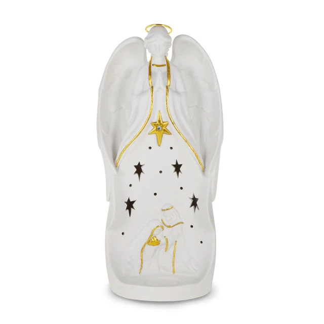 Illuminate your home in the peaceful light of that very first Christmas with this ceramic angel figurine tea-light holder. Featuring cutout star designs and an embossed design of Mary and Joseph holding the baby Jesus in her white robes, this elegant angel abides over the scene with her hands together in prayer. Sculpted details and gold accents add beauty to this Joanne Wright statue that makes a thoughtful Christmas gift for yourself or a loved one. Tea-light holder is meant to be used with a battery-operated candle (not included).