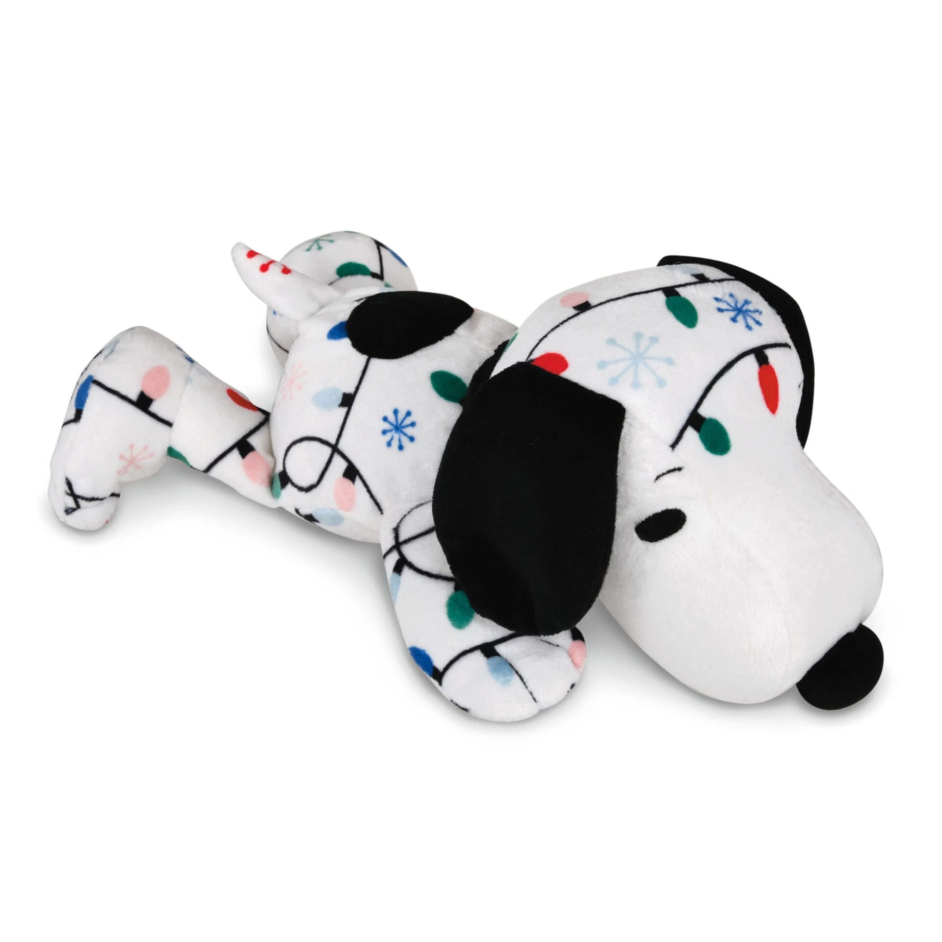 - Peanuts Snoopy stuffed animal features a posable, floppy body with Christmas lights design.