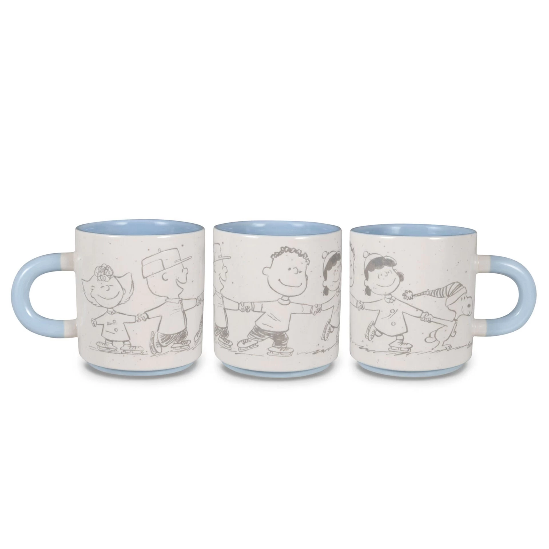 - Mug with glazed blue interior and handle features a gray-and-white design of the Peanuts gang ice-skating.