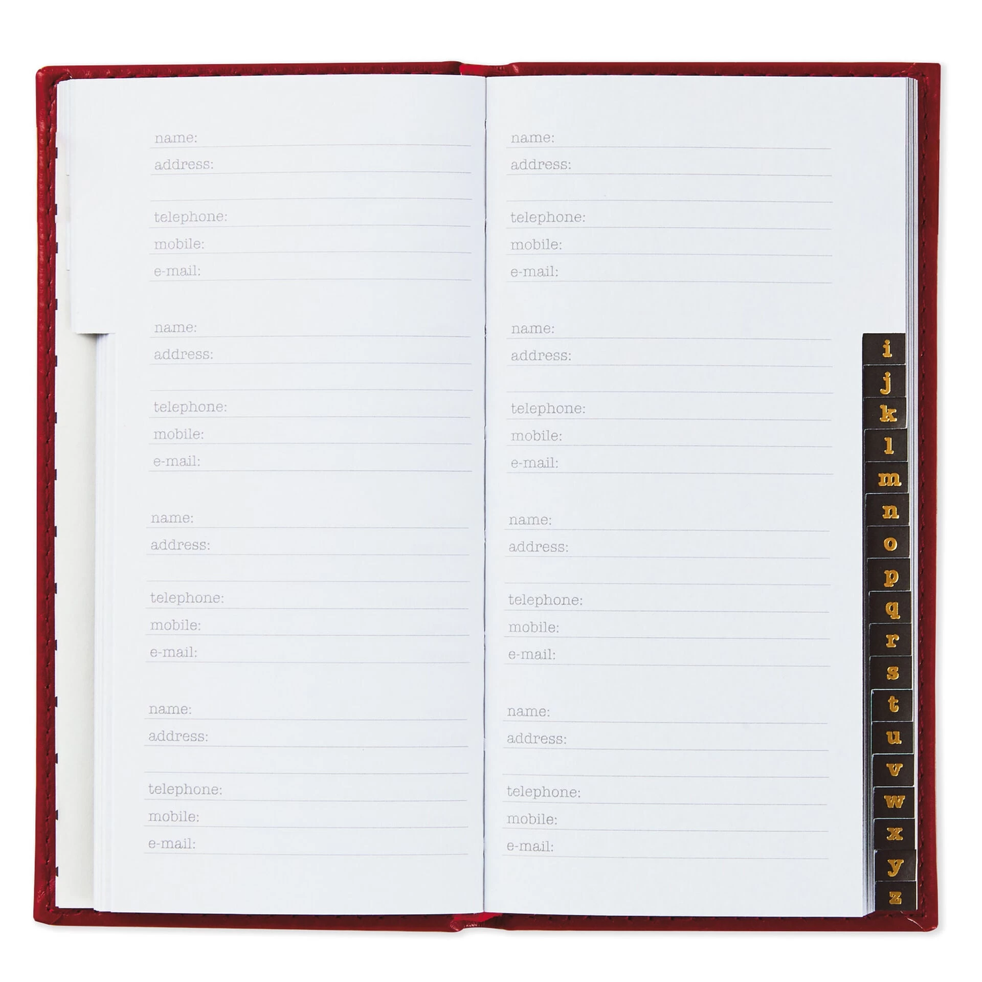 Go old school with this red faux leather slim address book. Find contacts easily with the alphabetical tabs inside. Each entry provides plenty of space for name, address, telephone number, mobile number and email address. Pebbled cover features gold stitching and a house design in gold foil.
