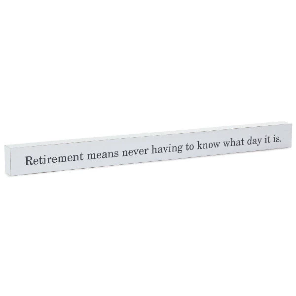 The beauty of retirement is not having to remember what’s on the schedule–because it’s clear in comparison to what it once was! Celebrate the days running together with this fun wood sign with a screenprint message that’s perfect for the retiree’s new “office.” Makes a great retirement gift for anyone.
