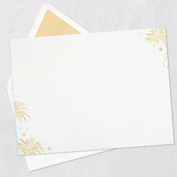 Blank greeting card features a fun design celebrating the 50th anniversary of Disney World. The card is decorated with a hexagonal die-cut window design flanked by detailed attachments of some of the most beloved park rides and attractions including Pirates of the Caribbean, Mad Tea Party and more. Glitter and gold foil accents add sparkle and shine. The cover message spells out a love for the Magic Kingdom, while the blank inside allows you to write your own personal message to the recipient.