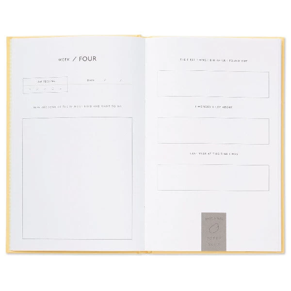 - Fabric-wrapped hardcover pregnancy journal features gold foil lettering.